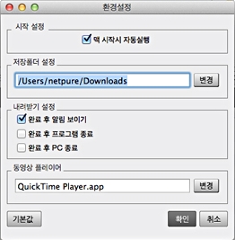 환경설정에서는 맥 시작시 자동으로 시작할 수 있는 기능과 컨텐츠를 저장할 수 있는 저장폴더 지정도 가능하고,